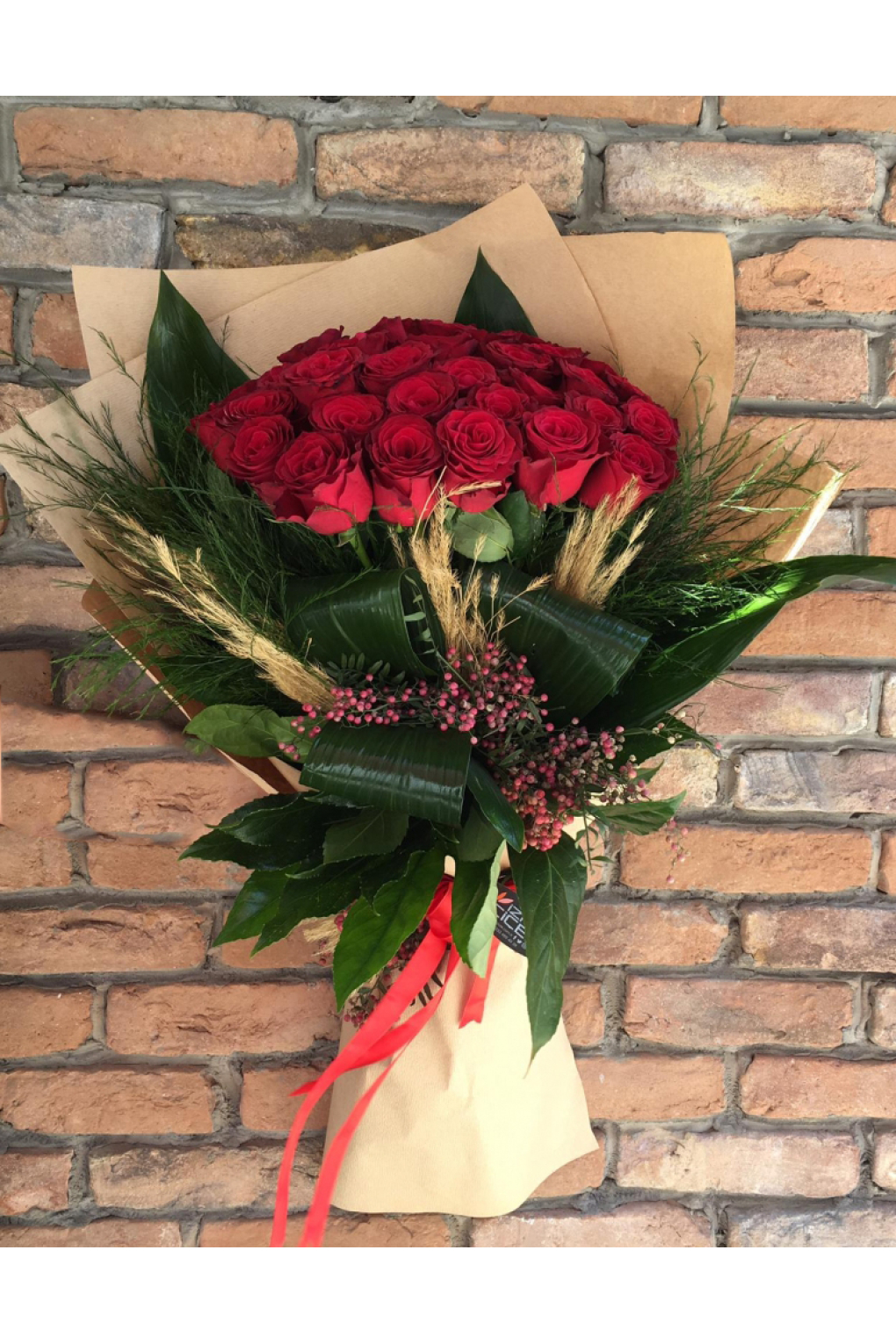 Bu şık buketimiz 41 adet ithal gül ve çeşitli garnitürler kullanılarak hazırlanmıştır.
