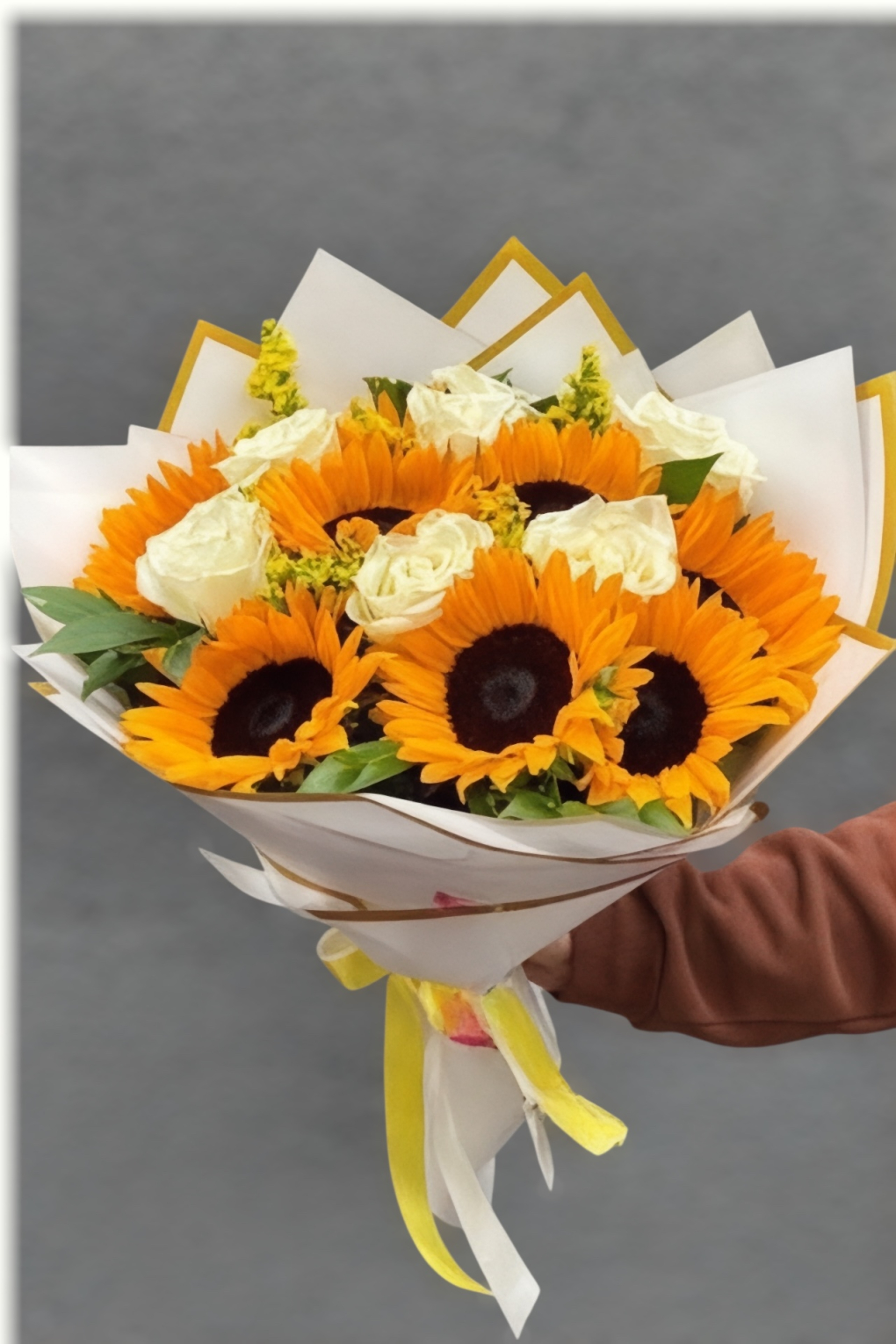 Sarı ay çiçeklerinin enerjisini beyaz güllerin zarafetiyle buluşturan bu özel bukette; 9 adet ay çiçeği, 7 adet beyaz gül ve taze yeşillikler kullanılmıştır.