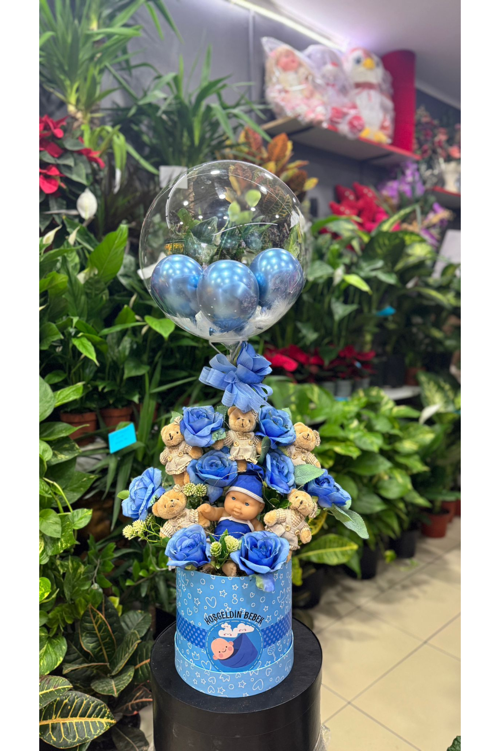 Yeni doğan erkek bebekler için özel olarak hazırlanan bu sevimli aranjman, mavi balonlar, peluş ayıcıklar ve yapay güllerin uyumuyla tasarlanmıştır.
