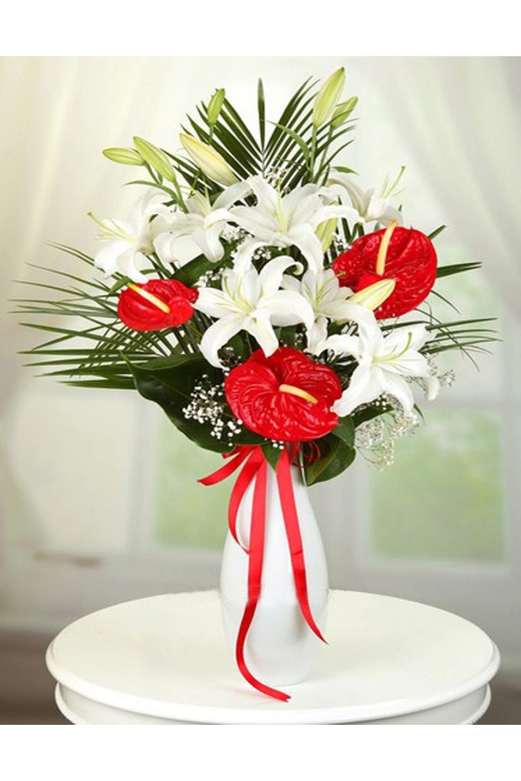 Özel saatler, özel dakikalar ve özel anlarda ,sevdiklerinizin her saniyesinde yanlarında olduğunuzu hissettirmek için , vazoda beyaz lilyumlar ve kırmızı antoryumlardan gönderin!