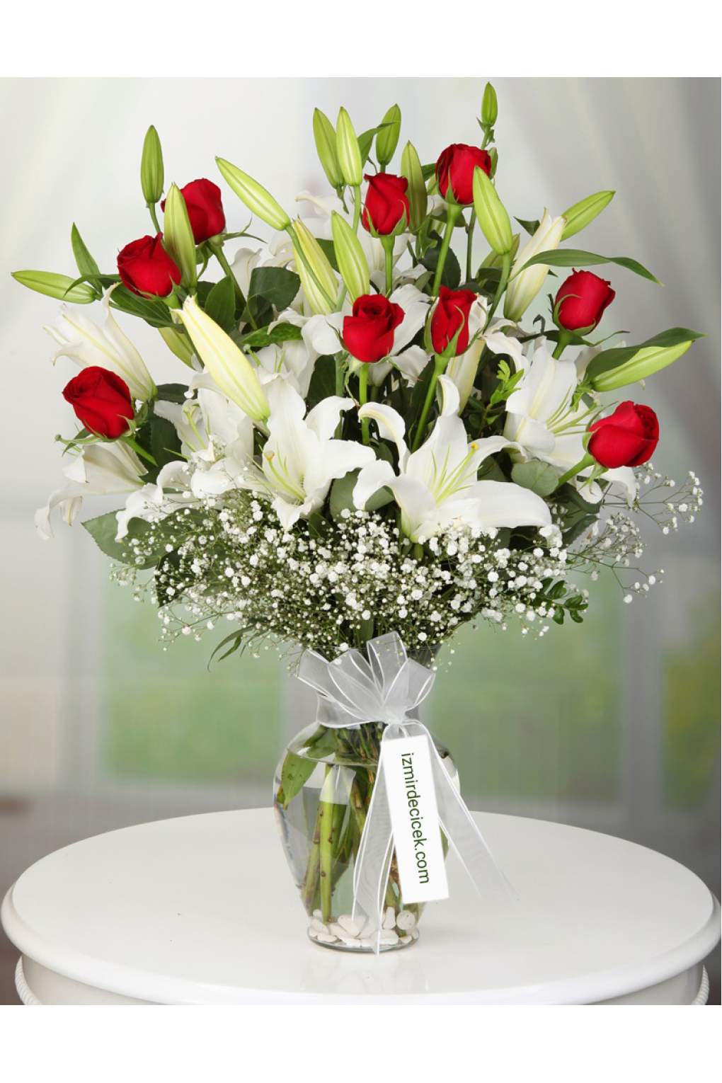 Asalet ve ihtişamı bir arada yaşatmak ve yaşamak için , cam vazoda lilyum ve güllerden hazırlanan vazo buketi gönderin.