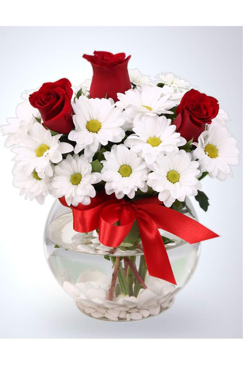 Beyaz Papatyalar ve 3 Adet Kırmızı Gül