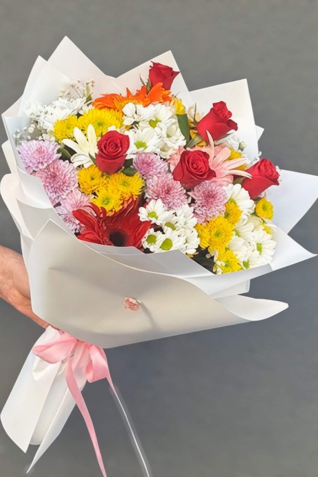 Baharın bütün canlılığını ve enerjisini yansıtan bu özel buket, renkli kır çiçekleri, güller, taze yeşillikler ve zarif cipsofilya ile özenle hazırlanmıştır. Beyaz ambalajın sade şıklığı, rengârenk çiçeklerin güzelliğini daha da ön plana çıkarır.