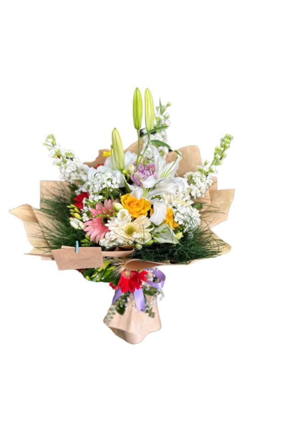 1 dal kazablanka, 5 adet renkli gelbera,3 adet şebboy,3 dal hüsnüyusuf,2 adet sarı gül