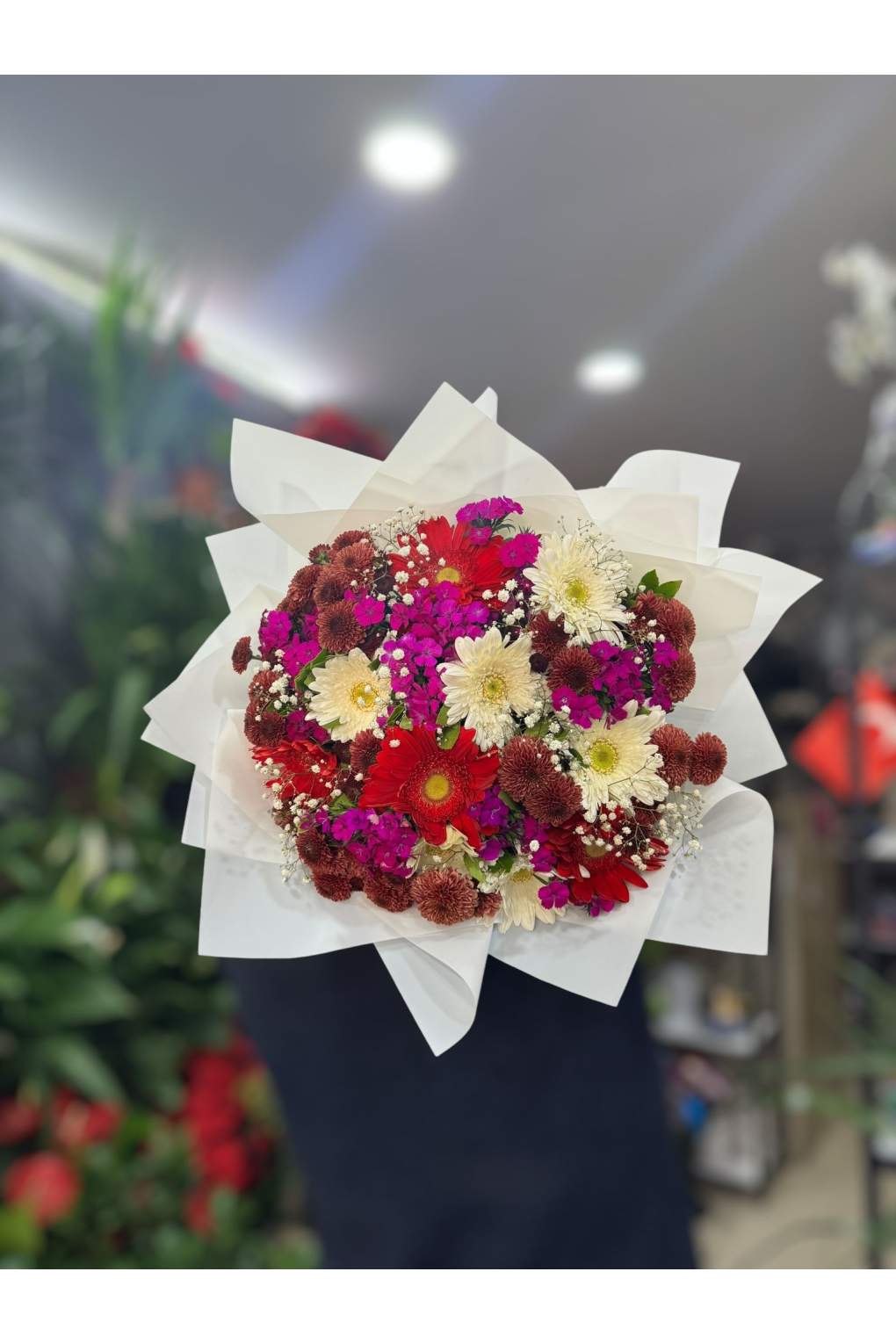 gelbera,hüsnüyusuf ve saray patlarıyla hazırlanmış mevsim buketi