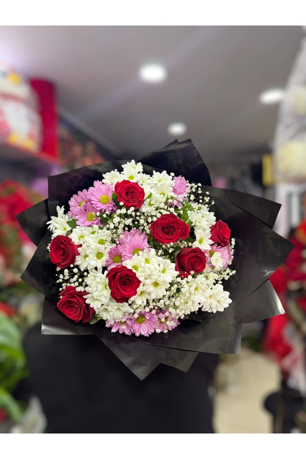 Romantik kırmızı güller ile pembe–beyaz kasımpatıların buluştuğu bu özel buket, sevdikleriniz için zarif ve gösterişli bir hediye alternatifi sunar. Toplamda 7 adet kırmızı gül, beyaz ve pembe kasımpatılar ve cipso detaylarıyla hazırlanan tasarım; modern siyah ambalajı ve kırmızı kurdelesiyle dikkat çeker.