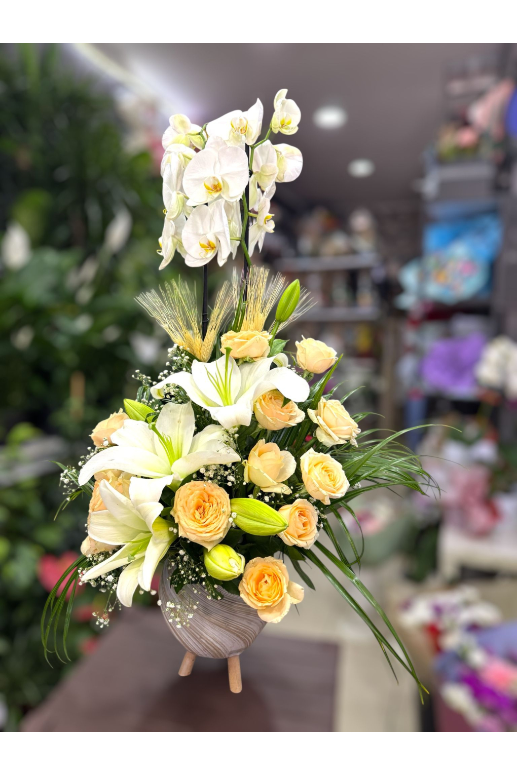 ayaklı saksı içerisin de 10 adet somon gül,çift dallı beyaz orkide,kazablanka,fenix yaprakları ve cipso ile hazırlanmıştır