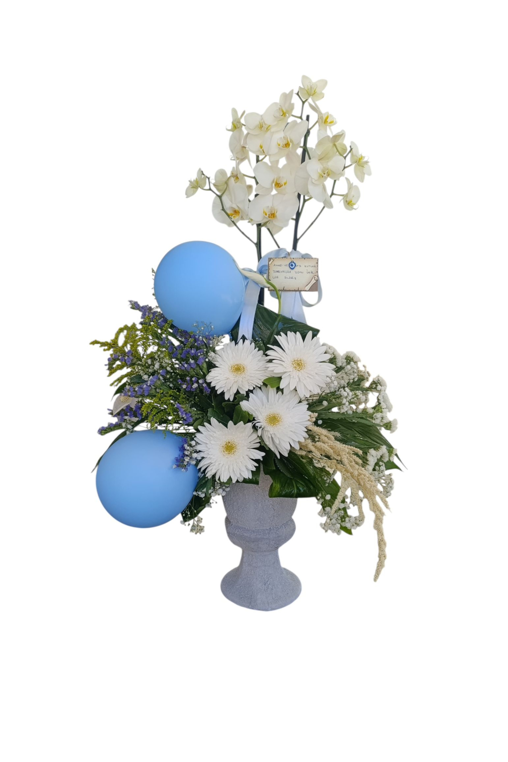 Ürün Kodu: IC-0532seramik büyük boy saksı içerisinde çift dallı beyaz orkide,gerbera,hüsnü yusuf,statüs ve kuru çiçeklerle hazırlanmıştır