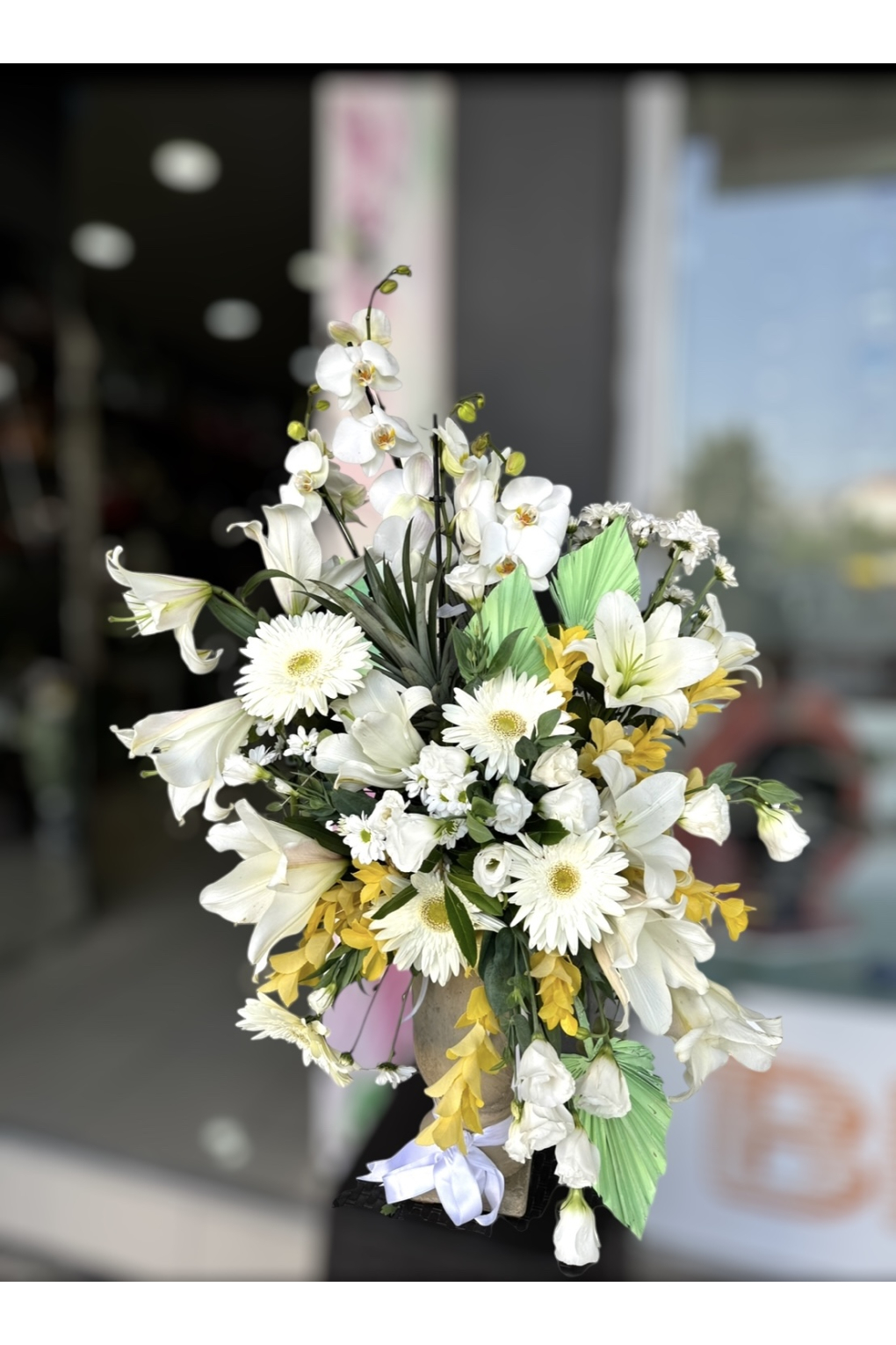 Çiçeklerimiz mevsime göre tazelik ve renk tonlarında küçük farklılıklar gösterebilir. Aranjmanı her zaman aynı stil, ölçü ve kaliteyle hazırlıyoruz; ancak doğanın birebir kopyası olmadığından görseldeki bazı çiçekler benzer alternatiflerle değiştirilebilir. Her durumda buketiniz aynı şıklıkta ve değerde hazırlanır-