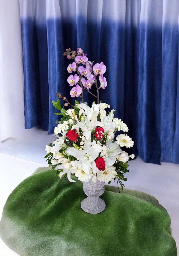 büyük seramik eskitme saksıda orkide,lilyum,gerbera,kırmızı güller