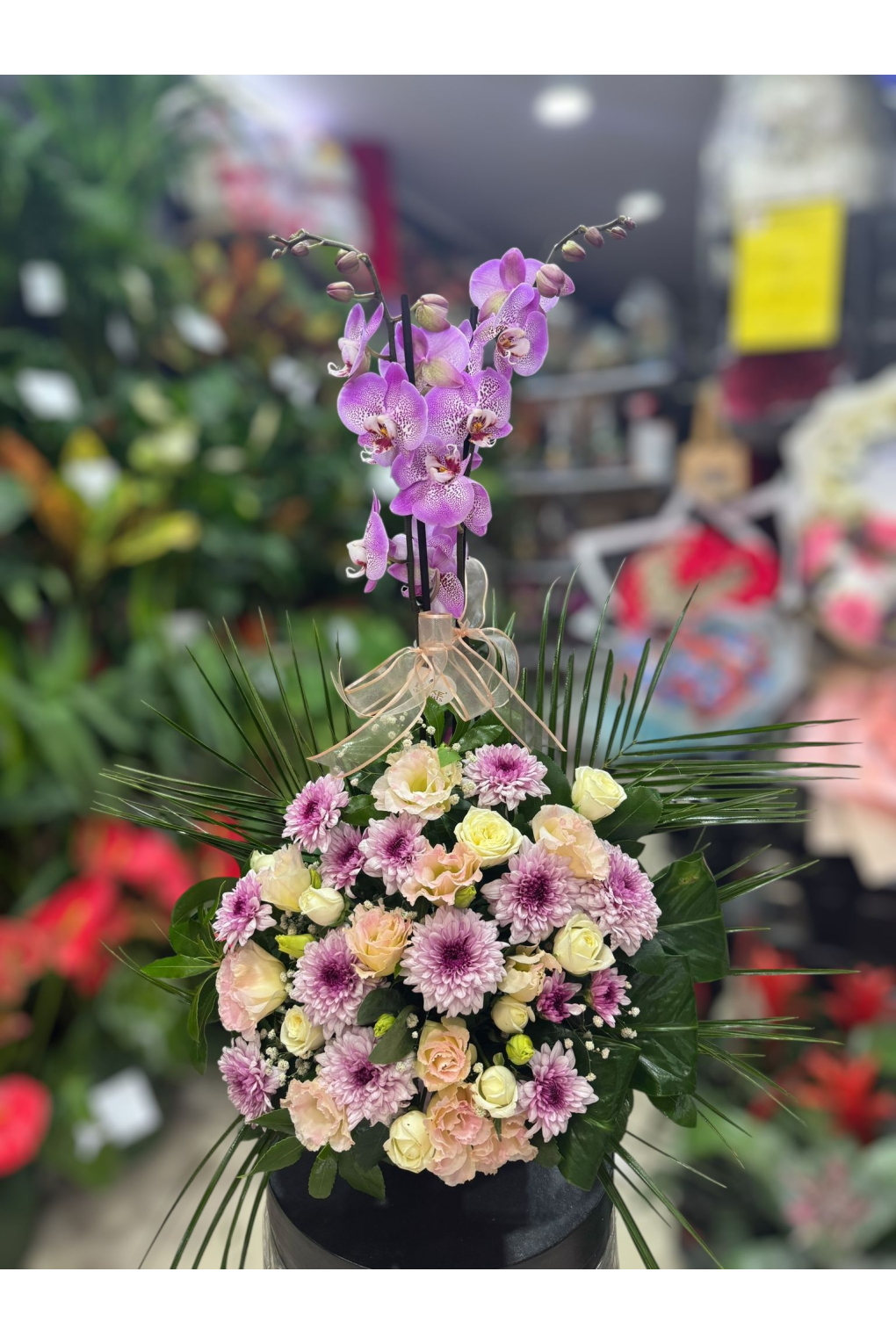 Zarafetin ve romantizmin birleştiği bu özel aranjman; mor orkide, beyaz güller pembe lisyantus ile mor tonlarında kasımpatının uyumuyla hazırlanmıştır.