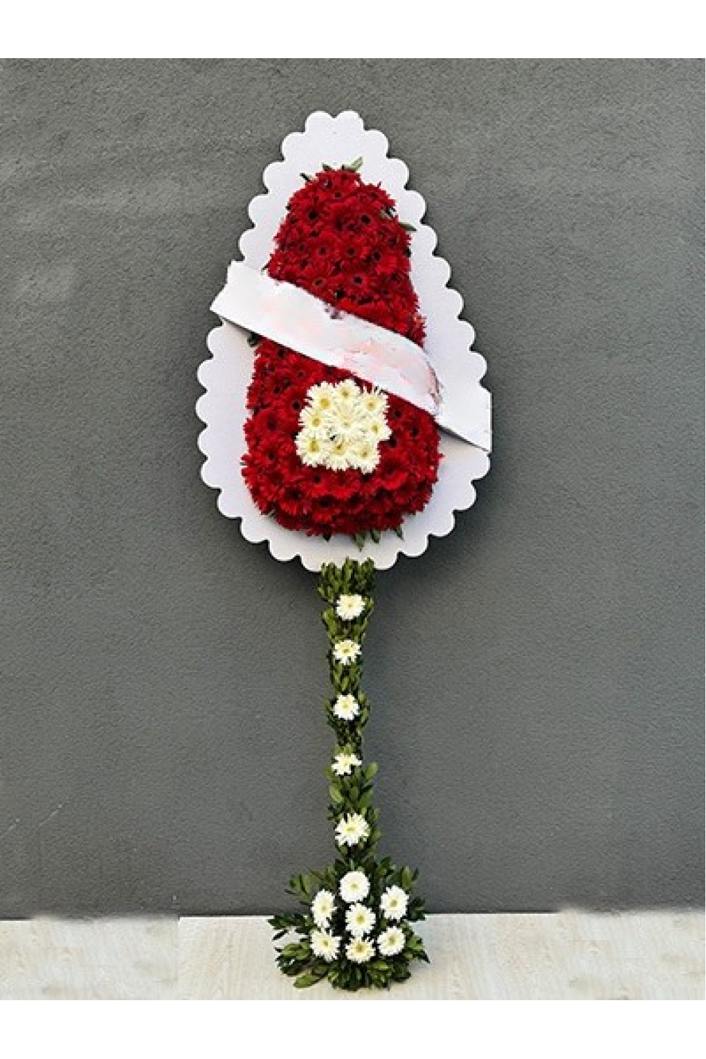 Üst kısmında yoğun kırmızı gelberalar, orta kısmında beyaz gelberalar, ayak ve alt bölümde ise beyaz gelbera süslemeleri yer alır.