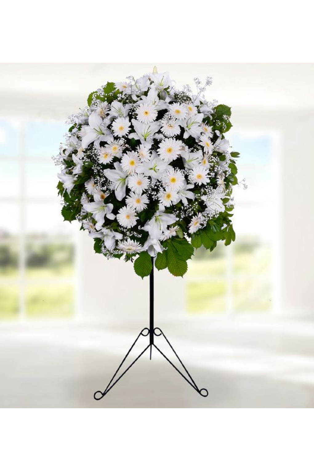 Ferforje ayak üzerine özenle hazırlanan bu beyaz tonlardaki çiçek aranjmanı, zarif ve sade görüntüsüyle açılış, tebrik ve özel günlerde şıklığı ön plana çıkarır.