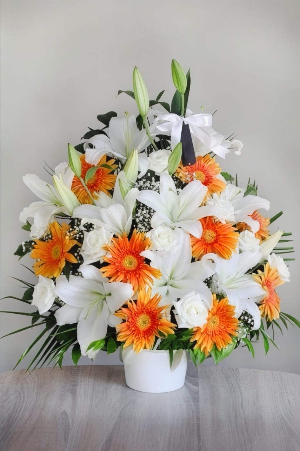 Zarif beyaz lilyumlar, canlı turuncu gelberalar ve saf beyaz güllerle hazırlanan bu şık aranjman; modern beyaz seramik kapta, özenle tasarlanmış gösterişli bir çiçek düzenlemesidir. Hem ferah hem de dikkat çekici görünümüyle açılışlar, tebrikler, kutlamalar ve özel günlerde tercih edilen etkileyici bir modeldir.