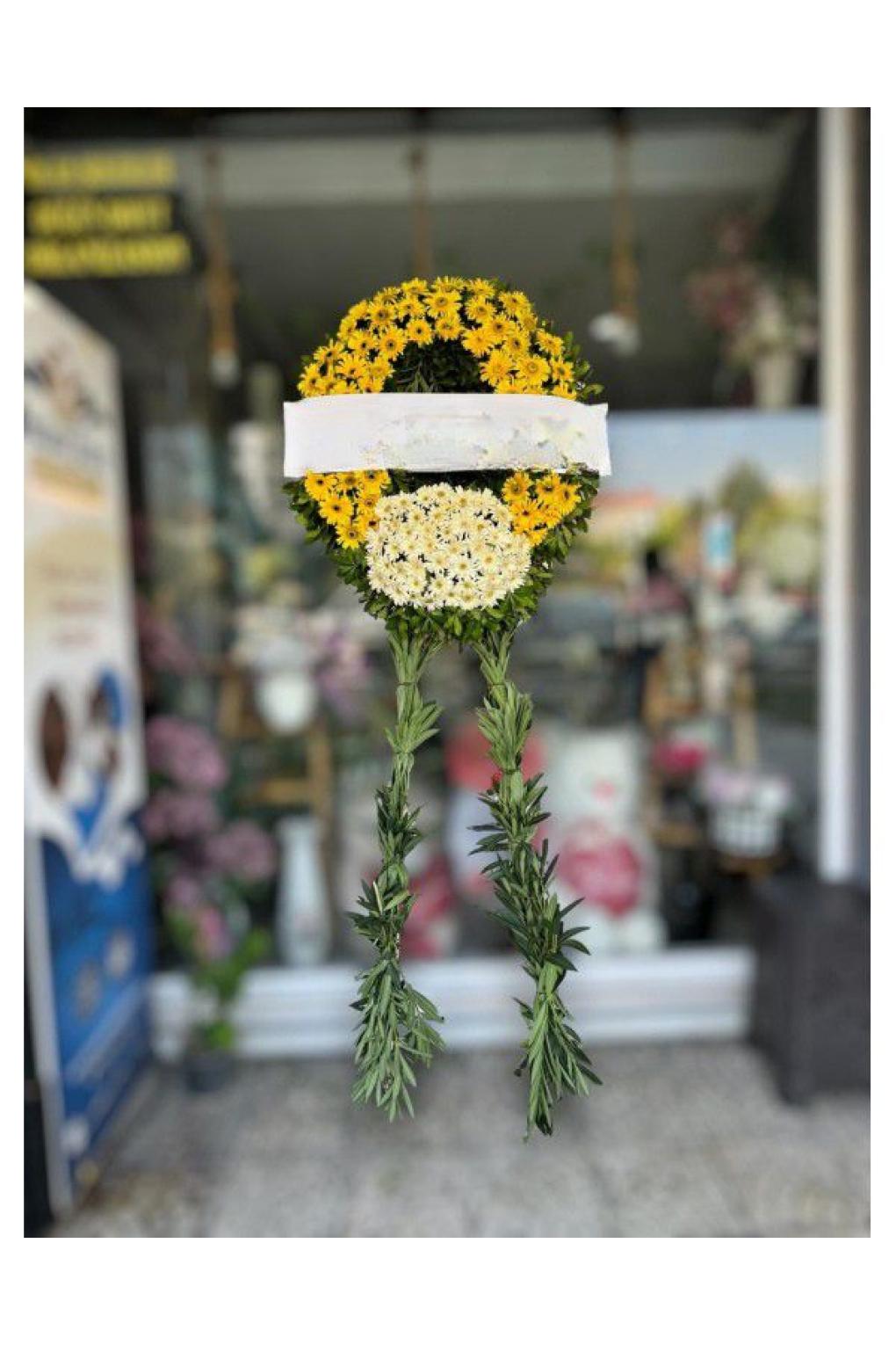 Yaklaşık 2.70 metre yüksekliğinde çelenk, sarı gerberalar ve beyaz gerberalar ile hazırlanmaktadır.