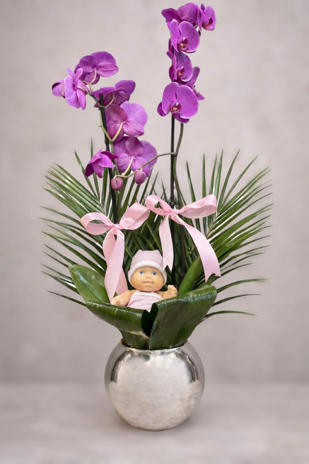 Modern çizgilerle tasarlanmış bu özel aranjman, mor orkidenin asil duruşunu şık metalik saksı ile bir araya getirir. İçerisinde yer alan sevimli bebek figürü, aranjmana duygusal ve anlamlı bir dokunuş katarak özellikle yeni doğan, hoş geldin bebek ve özel an kutlamaları için eşsiz bir hediye alternatifi sunar.