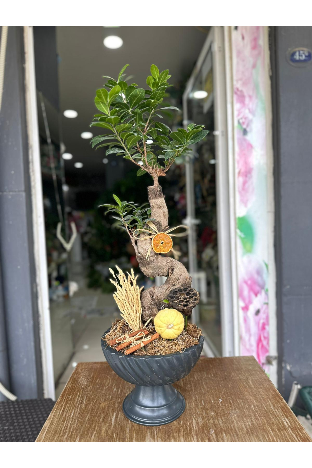 bonsai tasarımı ve çeşitli süslerle süslenmiş seramik saksıya ekilmiş şık bir bonsai bitkisi