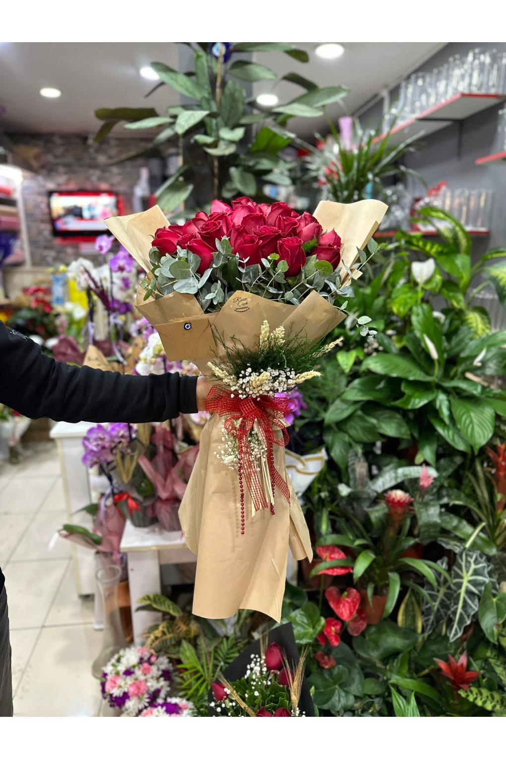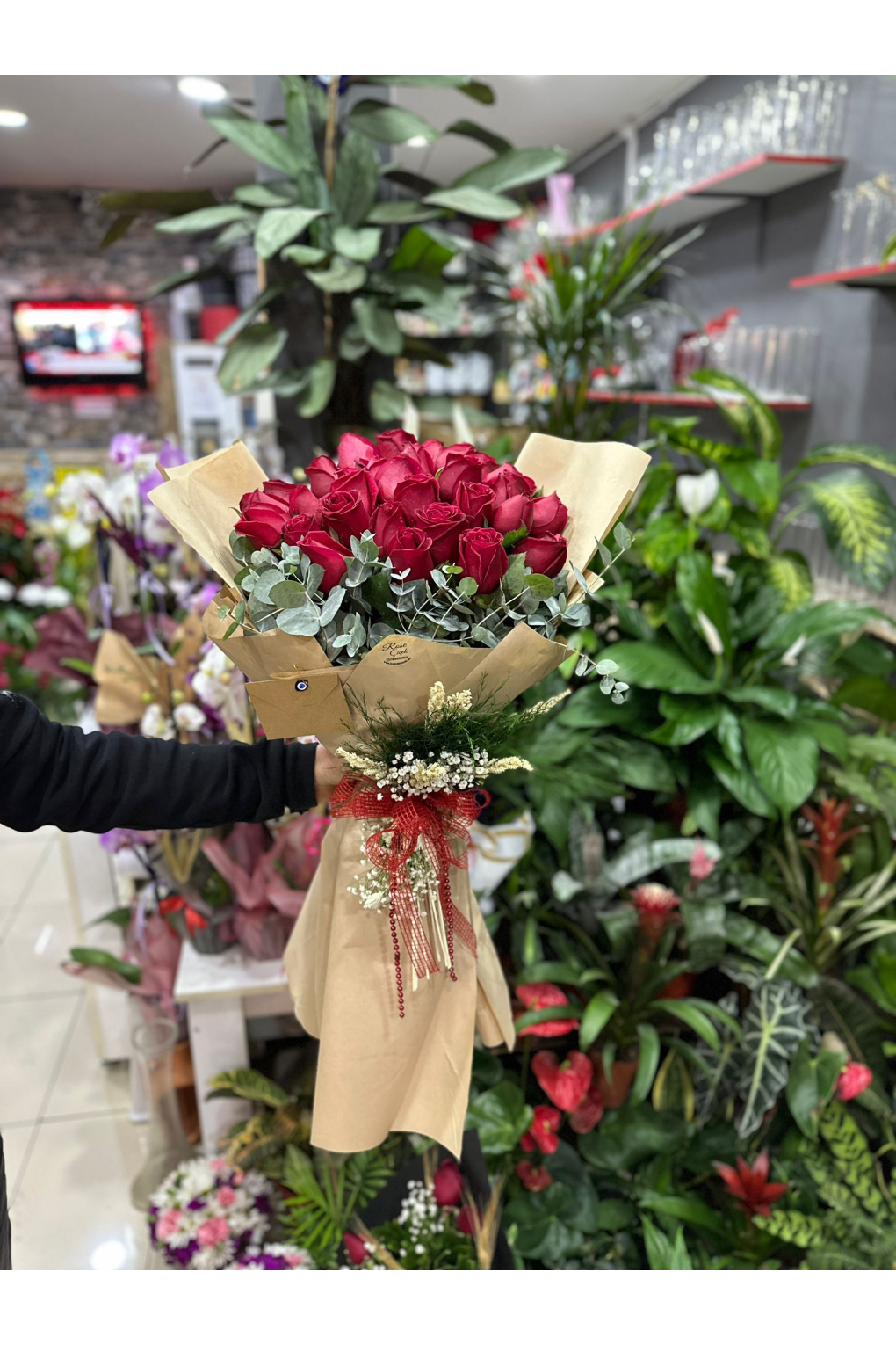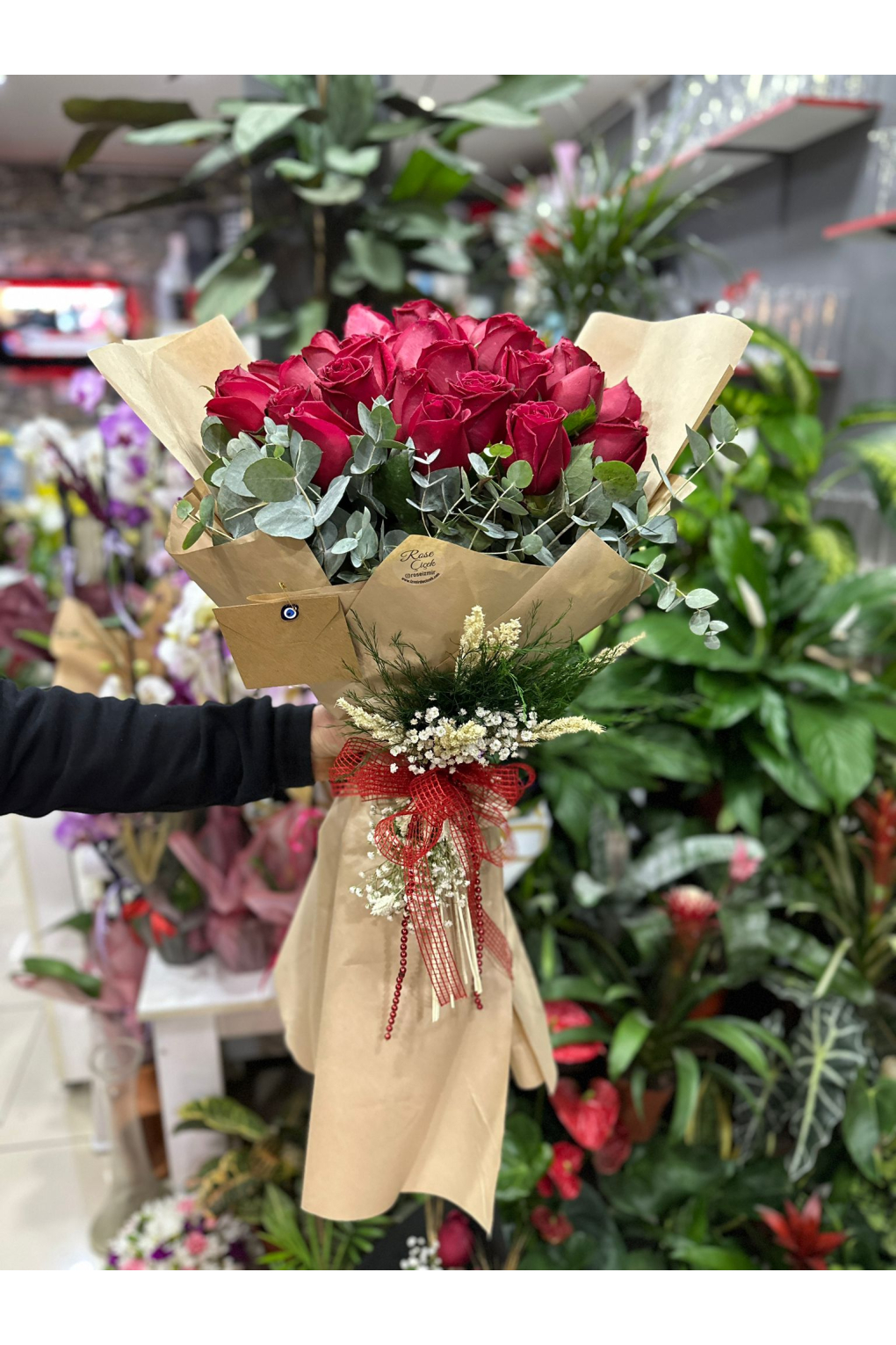 30 adet gül okaliptus ve kuru çiçeklerle süslenmiş gül buketi