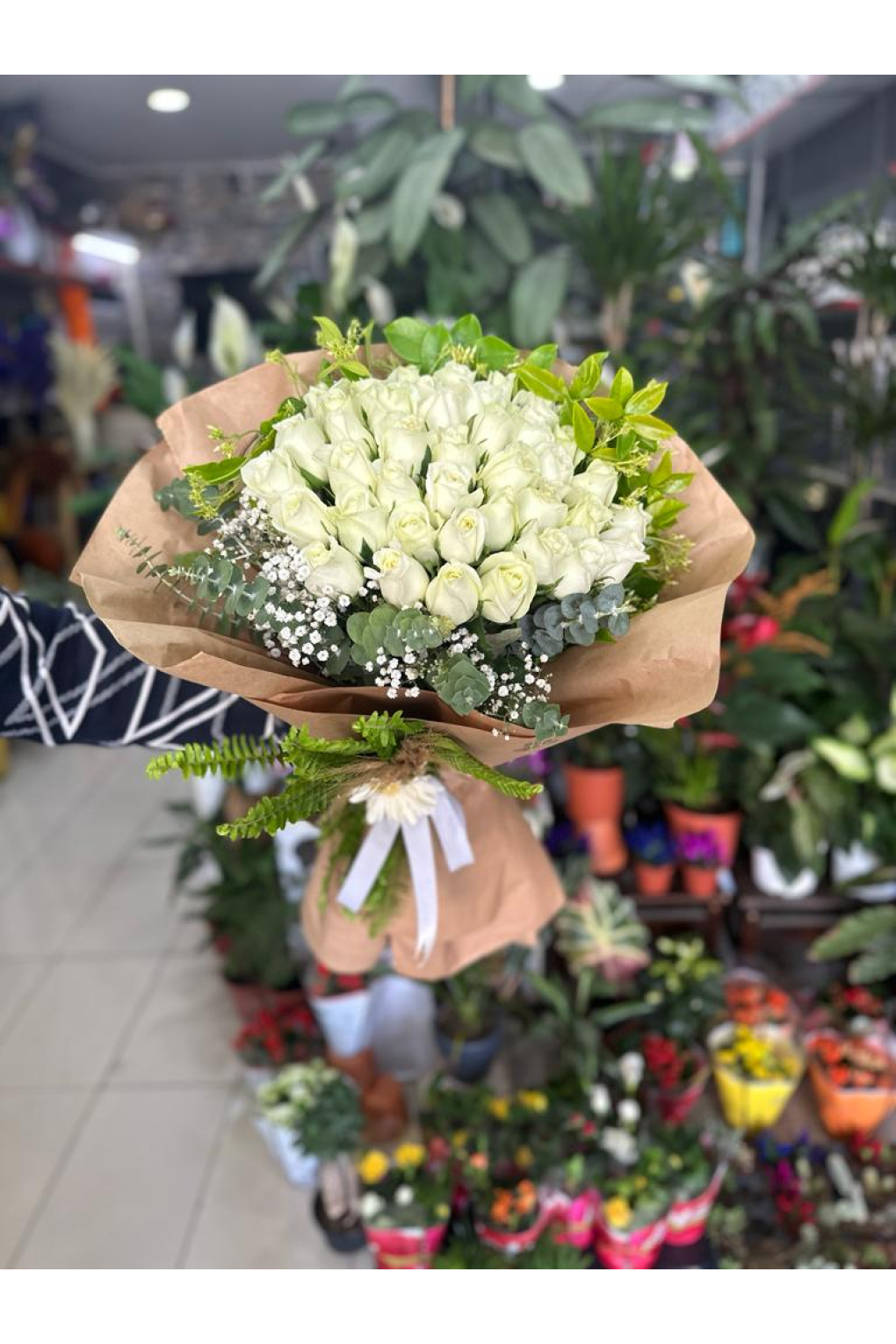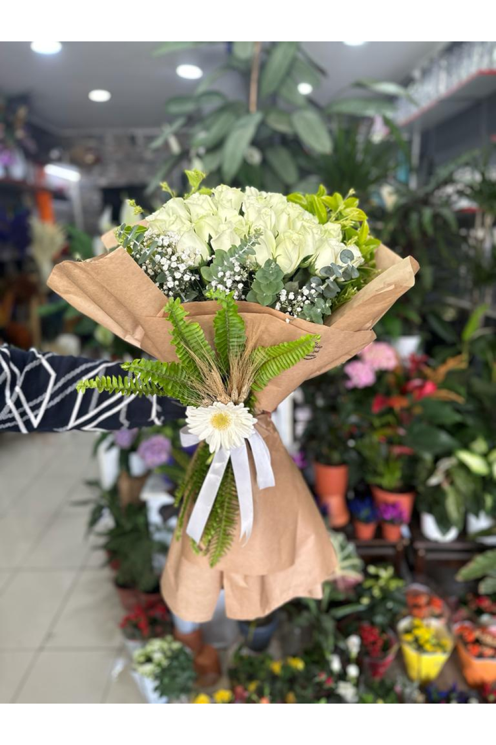 41 adet beyaz güllerle hazırlanmış okaliptus,cipso,panjur,gelbera ile süslenmiş bir buket