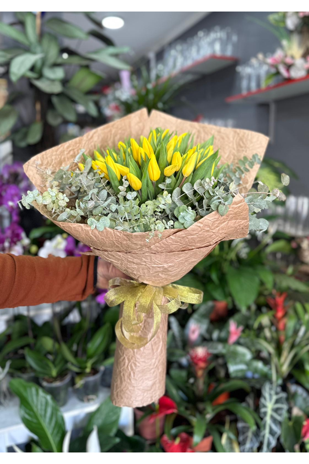 50 adet ithal hollanda lalesiye hazırlanmış çeşitli garnitürlerle süslenmiş şık bir lale buketi