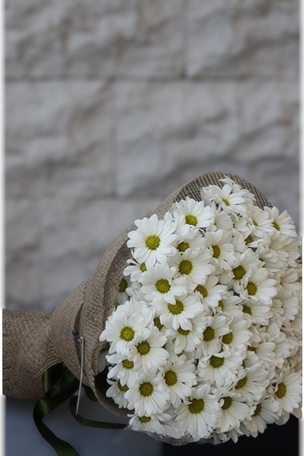 Saflığı ve sadeliği temsil eden beyaz papatyalar, doğal jüt ambalajla birleşerek zarif ve sıcak bir buket ortaya çıkarıyor. Dolgun görüntüsü ve taze çiçek yapısıyla bu özel tasarım; doğum günü, teşekkür, geçmiş olsun ve sürpriz gönderimler için İzmir’de en çok tercih edilen modellerden biridir.