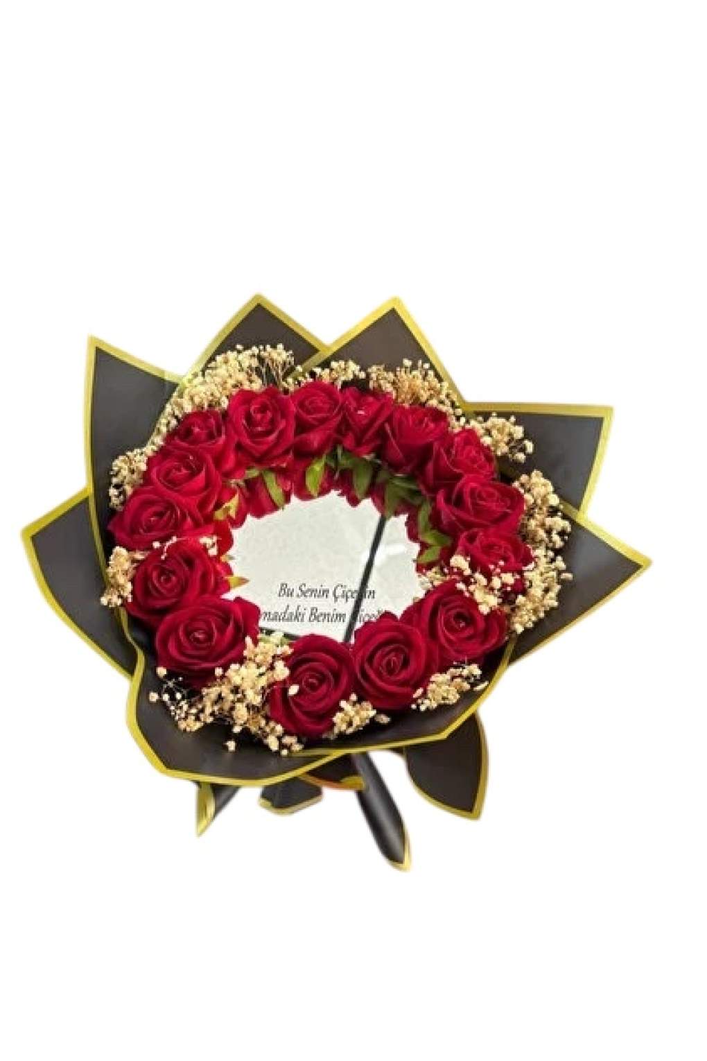 Kadife yapay kırmızı güllerle hazırlanan aynalı yazılı buket, şık tasarımı ve kalıcı yapısıyla sevdiklerinize uzun yıllar hatıra kalacak özel bir hediye sunar. Buketin merkezinde yer alan aynada bulunan “Bu senin çiçeğin, aynadaki benim” yazısı, romantik ve anlamlı bir mesajla duygularınızı en zarif şekilde ifade eder. Solmayan kadife güller sayesinde bakım gerektirmez ve her ortamda dekoratif bir görünüm sağlar.