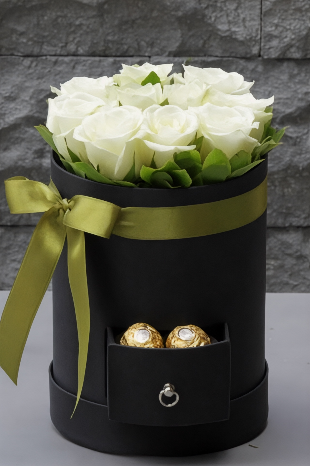Şıklığın ve zarafetin buluştuğu bu özel aranjman, 10 adet beyaz gül ile hazırlanmış olup modern çekmeceli siyah kutu içerisinde sunulmaktadır.