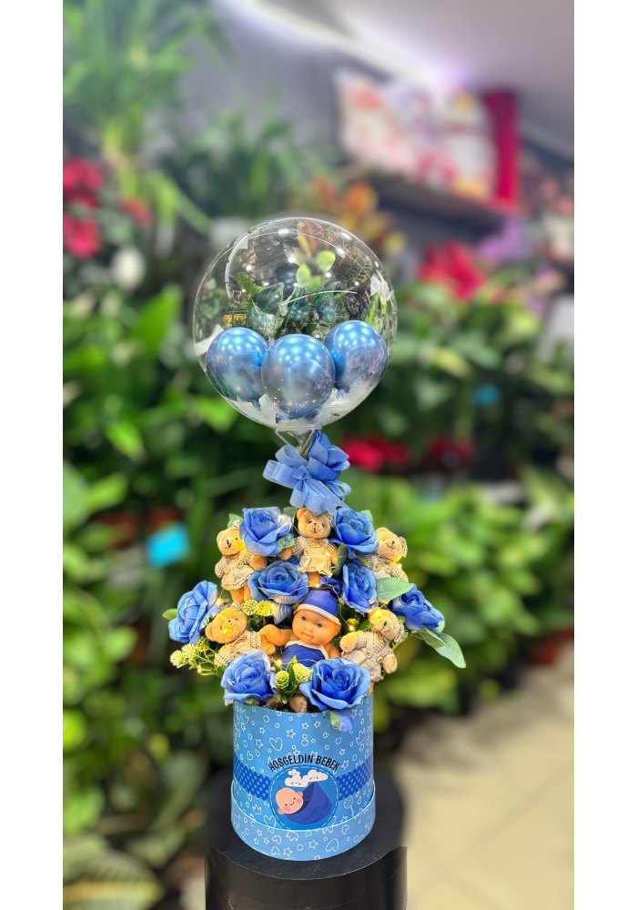 Bu şık “Hoş Geldin Bebek” aranjmanı, mavi temalı kutusunda peluş ayıcıklar, yapay güller, mini bebek figürü ve ışıklı detaylarla hazırlanmıştır. Üst kısmında şeffaf balon içerisinde mavi mini baloncuklar yer alır.