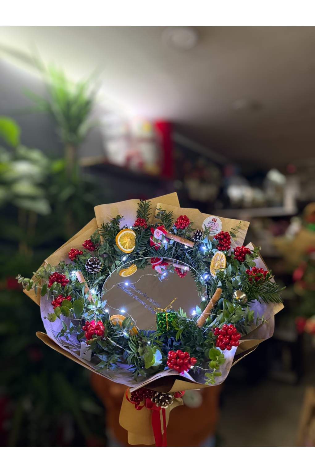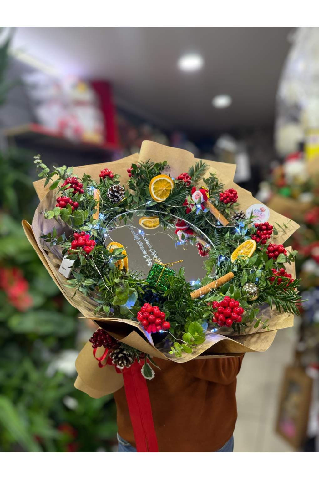 Buket içerisinde doğal kokina dalları, çam yeşillikleri, tarçın çubukları, kuru portakal dilimleri, minik yılbaşı süsleri ve LED ışıklandırma kullanılmıştır.