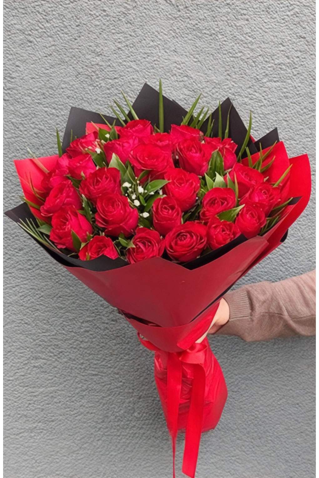 25 adet kırmızı gül ile hazırlanan bu gösterişli buket, aşkı, tutkuyu ve güçlü duyguları simgeler. Özenle seçilen taze kırmızı güller; modern siyah-kırmızı ambalaj, yeşillikler ve şık kurdele ile estetik bir tasarıma dönüştürülmüştür.