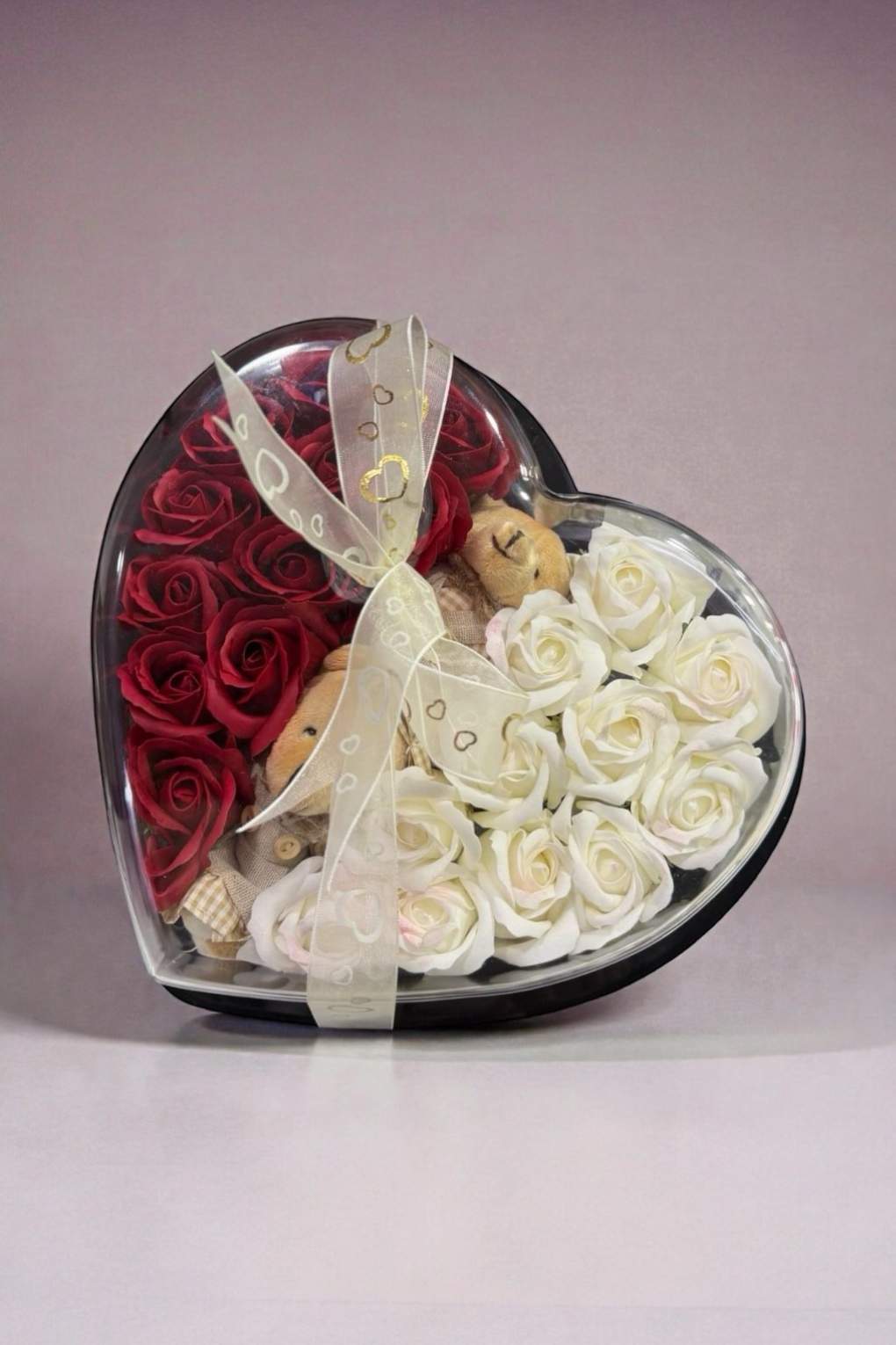 Kırmızı yapay güller tutkuyu, beyaz yapay güller ise saf sevgiyi temsil eder. Şeffaf kalp kutu içerisinde hazırlanan bu özel tasarım, uzun yıllar saklanabilecek kalıcı ve anlamlı bir hediyedir.