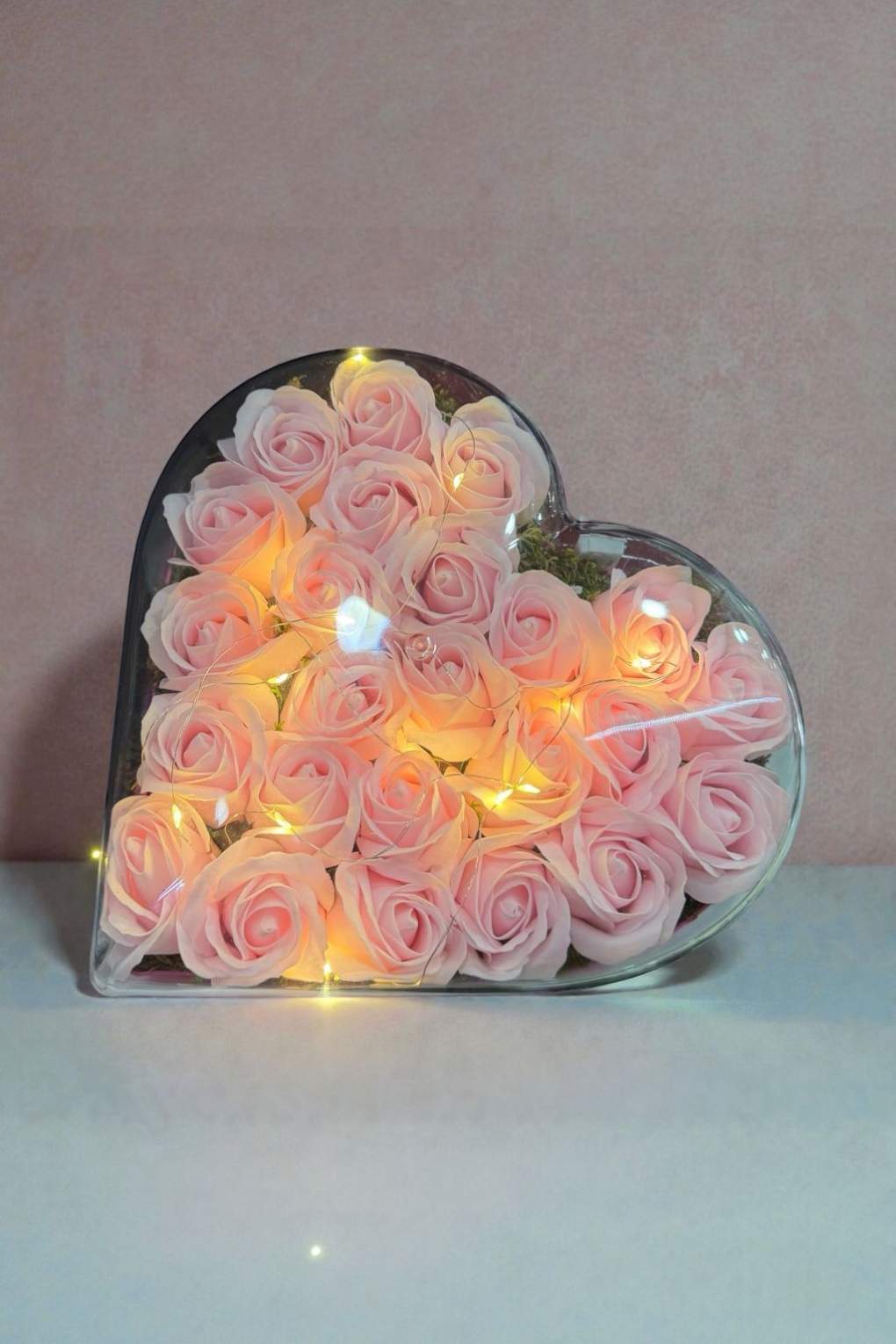 Kalp formunda şeffaf pleksi (akrilik) kutu içerisinde hazırlanan ışıklı pembe gül aranjmanı, romantik ve modern tasarımıyla özel anlara zarafet katıyor.