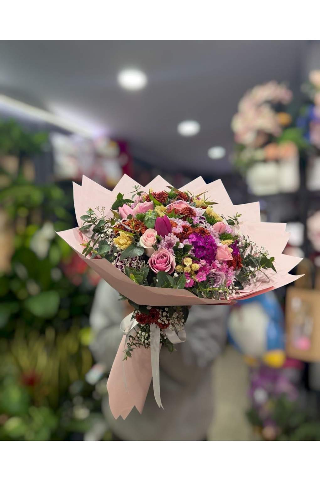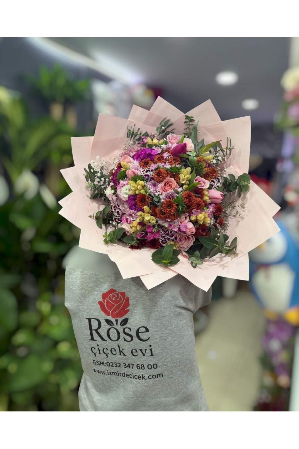 İzmir’de sevdiklerinize renkli, zarif ve dolu dolu bir sürpriz yapmak isteyenler için hüsnüyusuf, gül, lale ve kasımpatı çiçeklerinden oluşan bu özel buket mükemmel bir tercihtir. Farklı çiçeklerin uyumu sayesinde hem enerjik hem de romantik bir görünüm sunar.