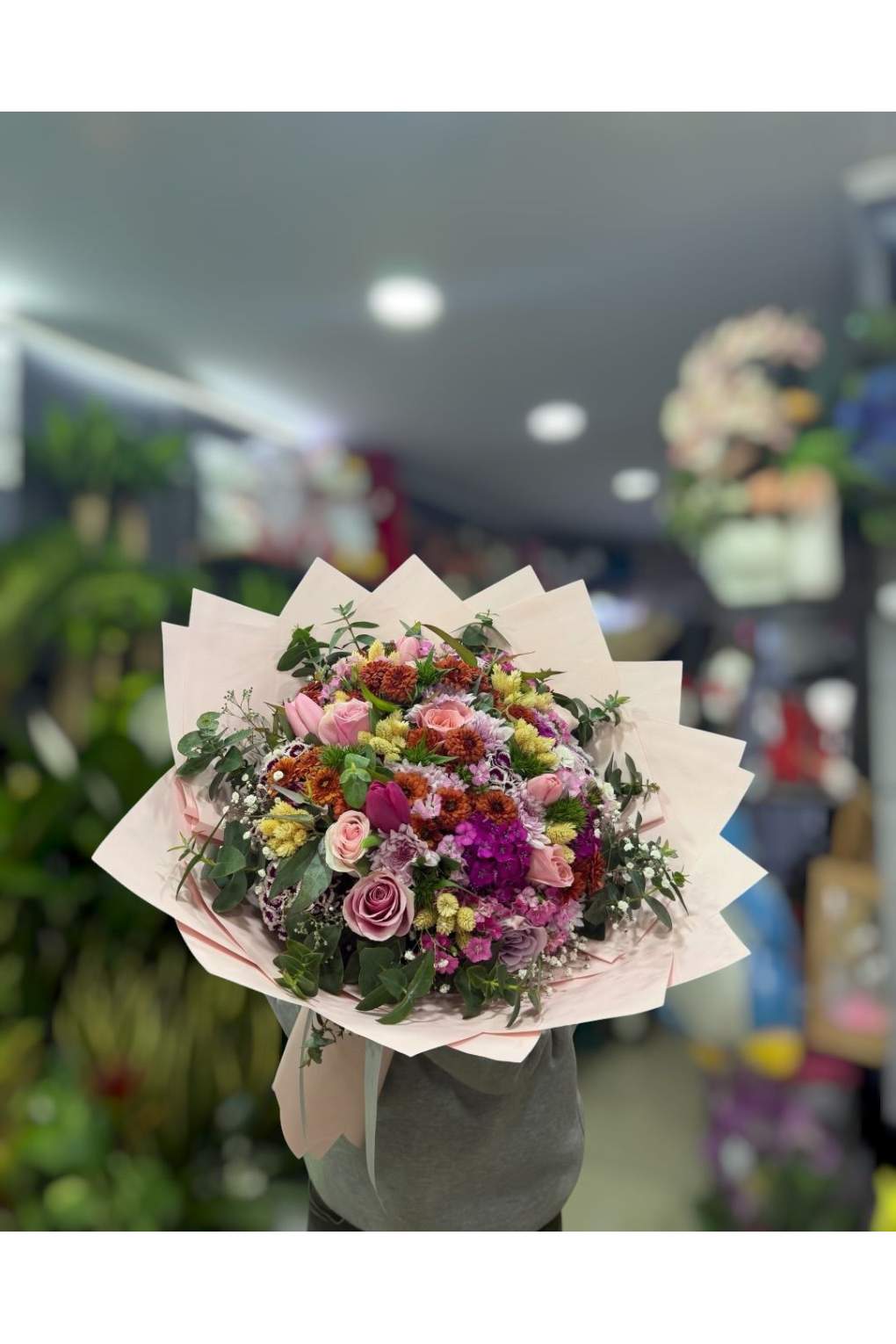 Özenle hazırlanan bu karışık buket; pastel tonlar, canlı renkler ve doğal yeşilliklerle zenginleştirilerek modern bir tasarım haline getirilmiştir.